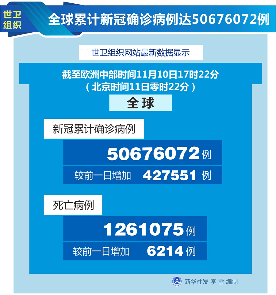 世衛(wèi)組織網站最新數據顯示,截至歐洲中部時間10日17時22分(北京時間11日零時22分),全球確診病例較前一日增加427551例,達到50676072例;死亡病例增加6214例,達到1261075例。