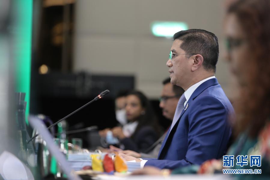11月16日,在馬來西亞吉隆坡,馬來西亞國際貿(mào)易和工業(yè)部部長阿茲明·阿里在亞太經(jīng)濟(jì)合作組織部長會議上講話。新華社發(fā)(亞太經(jīng)合組織供圖)