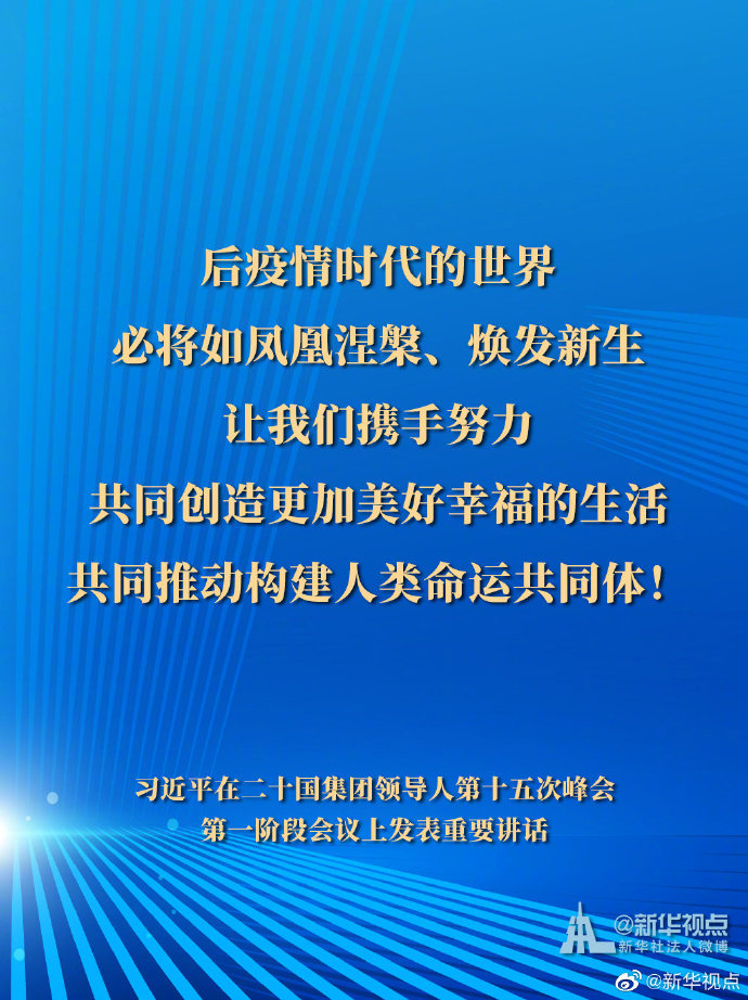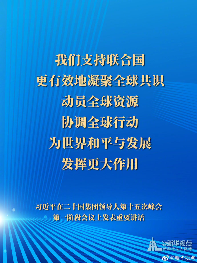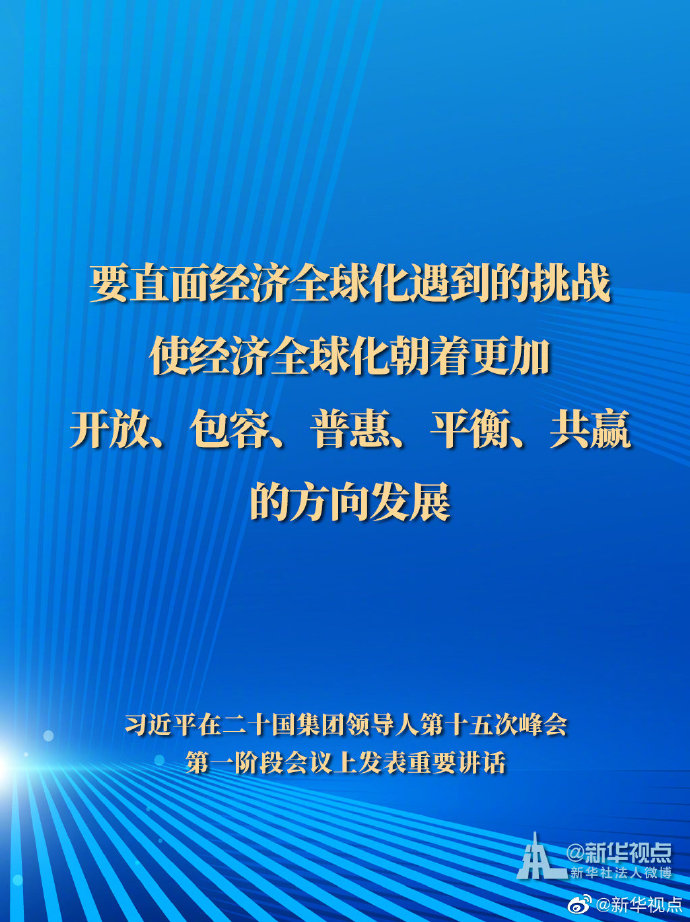 11月21日,國家主席習(xí)近平在二十國集團領(lǐng)導(dǎo)人第十五次峰會第一階段會議上發(fā)表重要講話。一起來看習(xí)主席的G20金句。