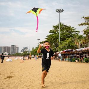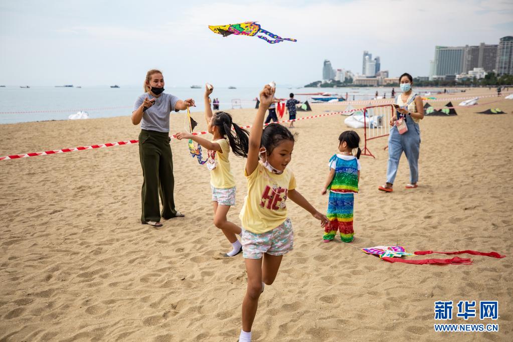 4月9日,兒童在泰國(guó)芭堤雅海灘上放風(fēng)箏。