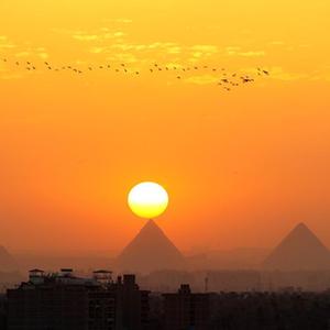這是4月14日從埃及開(kāi)羅拍攝的吉薩金字塔群日落景色。新華社記者 王東震 攝