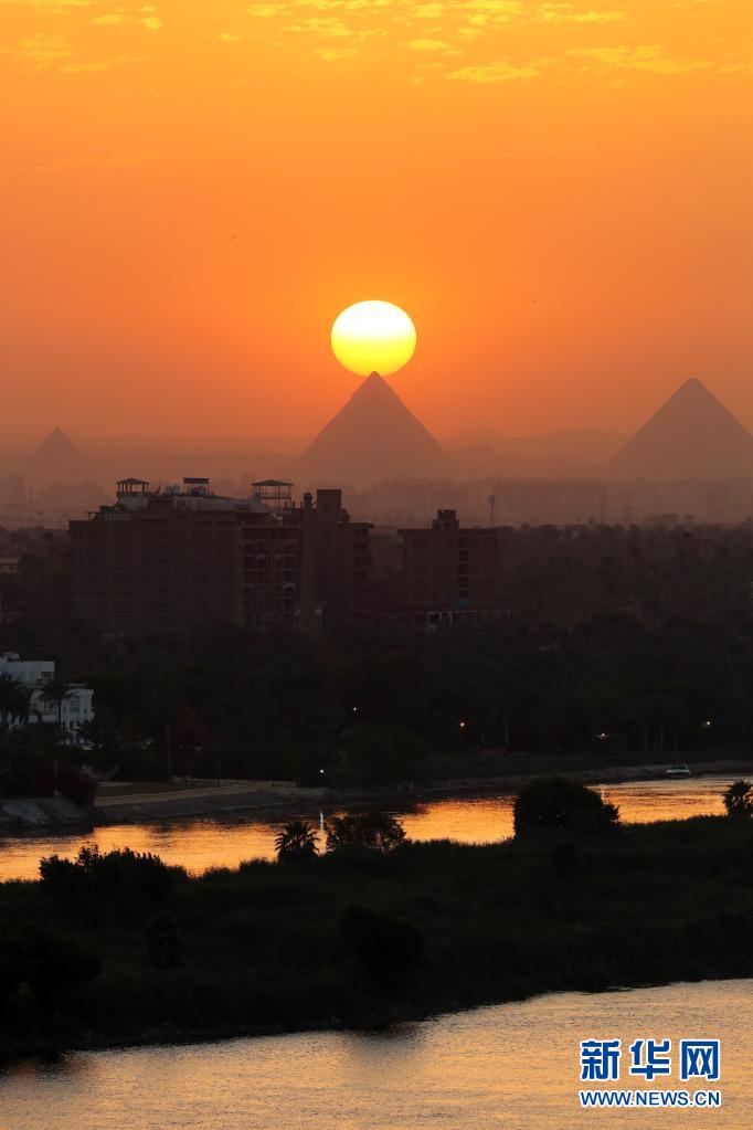 這是4月14日從埃及開(kāi)羅拍攝的吉薩金字塔群日落景色。新華社記者 隋先凱 攝
