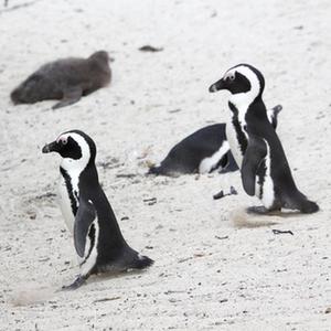 4月25日,一群非洲企鵝在南非西蒙鎮(zhèn)企鵝灘上行走。
