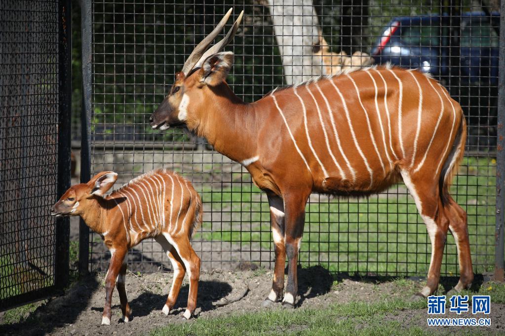 5月10日,兩周大的幼年山地紫羚與母親一起在波蘭首都華沙的華沙動(dòng)物園的籠舍中散步。