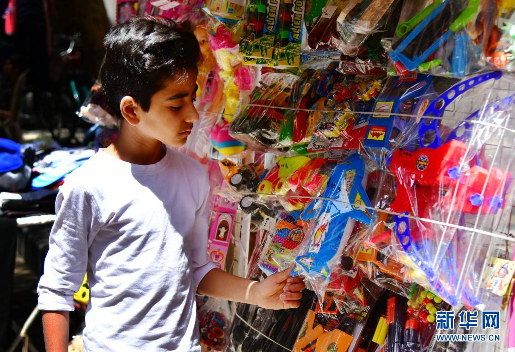 5月11日,一名兒童在敘利亞首都大馬士革的市場(chǎng)上挑選玩具。
