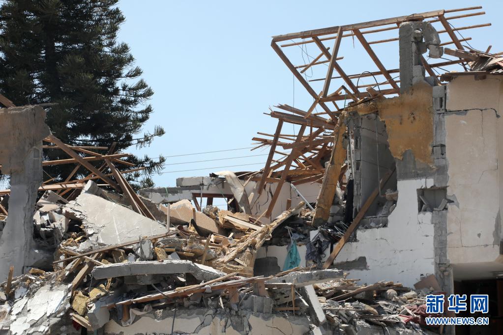 這是5月13日在以色列中部城市耶胡德拍攝的被火箭彈擊中損毀的房屋。