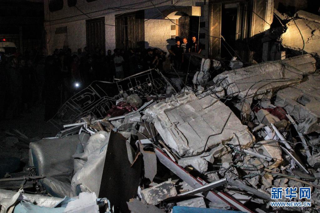 5月15日,人們聚集在加沙城一處遭空襲的難民營。