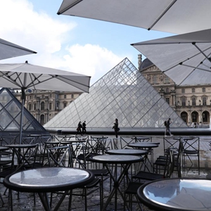 5月19日,法國(guó)巴黎盧浮宮博物館旁的餐館戶外區(qū)域準(zhǔn)備迎客。