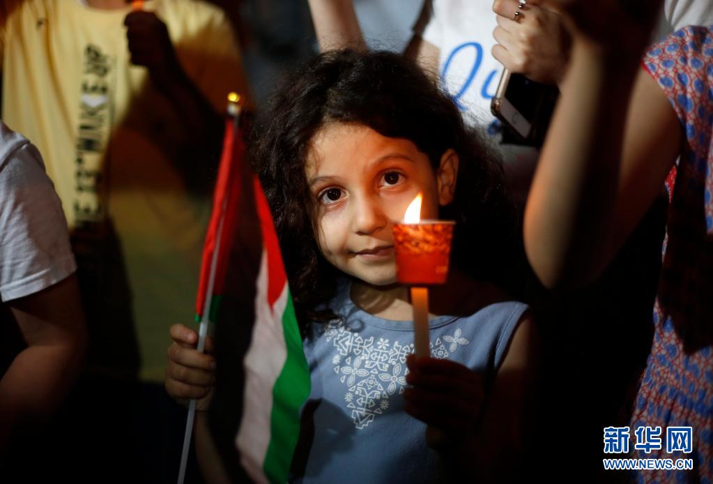 5月20日,一名兒童在約旦河西岸城市納布盧斯參加聲援活動。