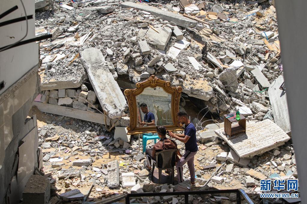 5月26日,在加沙地帶北部的城鎮(zhèn)貝特拉希亞,23歲的巴勒斯坦理發(fā)師阿卜杜拉·扎瓦拉在他被以色列炸毀的房屋前為顧客免費服務(wù)。 新華社發(fā)(里澤克·阿卜杜勒·賈瓦德攝)