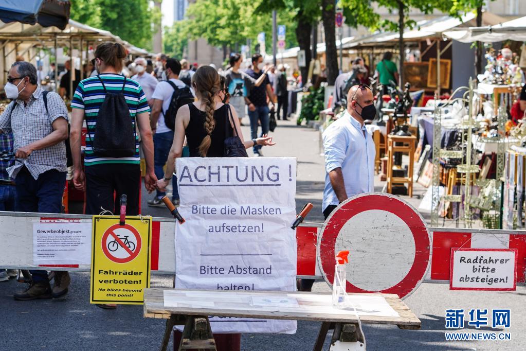 6月6日,德國首都柏林一處“跳蚤市場(chǎng)”入口的告示牌提示人們佩戴口罩并保持社交距離。