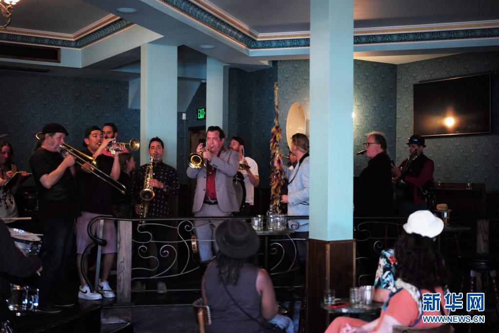 6月15日,一支樂(lè)隊(duì)在美國(guó)加利福尼亞州舊金山的一家酒吧內(nèi)演奏。