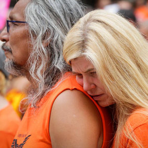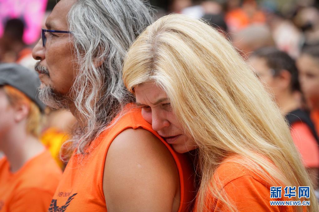 7月1日,抗議者在加拿大溫哥華舉行的集會(huì)活動(dòng)上悼念遭到殘害的兒童。