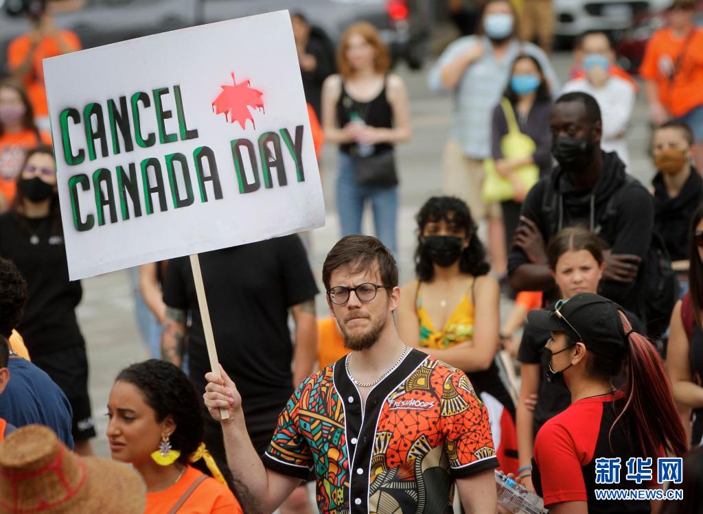 當(dāng)天是加拿大日,上千名抗議者在溫哥華集會,悼念加拿大在強(qiáng)制“同化”原住民過程中遭到殘害的兒童,呼吁取消加拿大日的慶祝活動(dòng)。