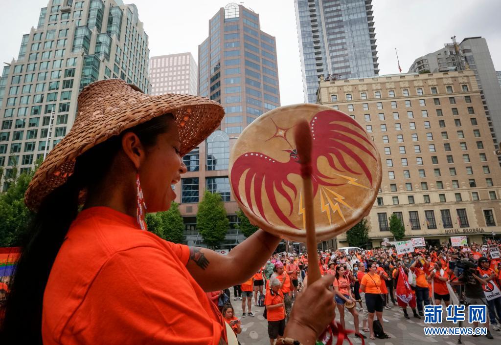 7月1日,原住民社團(tuán)成員在加拿大溫哥華舉行的集會(huì)上敲響原住民文化圖案的手鼓。